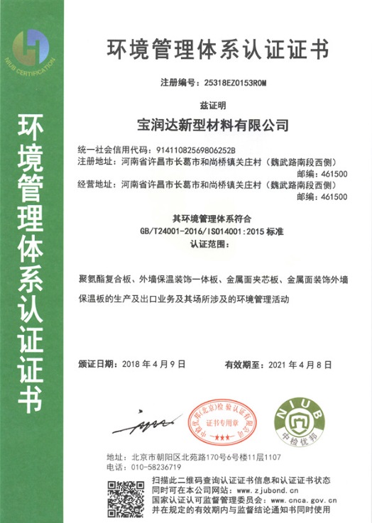寶潤達環(huán)境管理體系認證證書